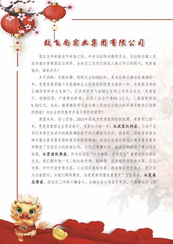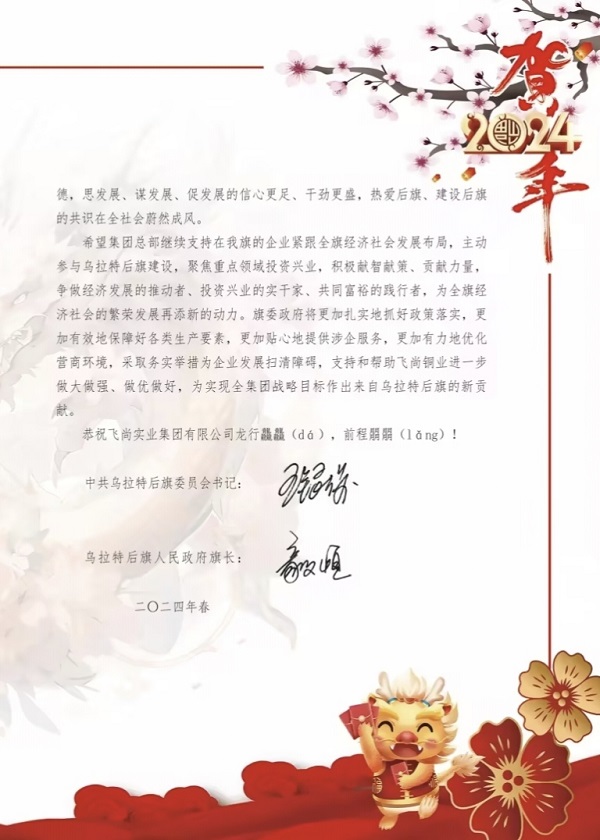 乌拉特后旗党委、当局从政策盈利、资本上风、成长态势三个方面,先容了本地的投资和营商情况,但愿飞尚团体持续撑持、紧跟全旗经济社会成长规划,自动到场乌拉特后旗扶植,聚焦重点范畴投资兴业,主动献智献策、进献气力,为全旗经济社会的繁华成长再添新能源。同时,旗委当局将加倍踏实地抓好政策落实,撑持和赞助飞尚铜业进一步做大做强、做优做好,为完成团体计谋方针作出来自乌拉特后旗的新进献。