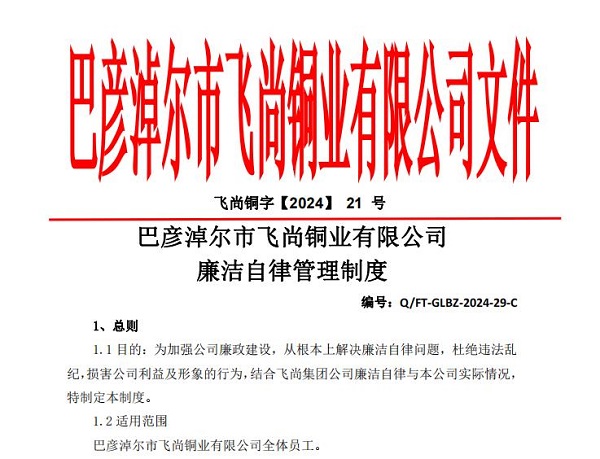 在各成员企业提交的《清廉自律办理轨制》中,飞尚铜业无限公司、芜湖飞尚资料无限公司不只逐条列出“廉政步履原则”和“清廉任务标准”,并对推销、发卖、财政、平常任务及重点任务法式等提出了详细请求。