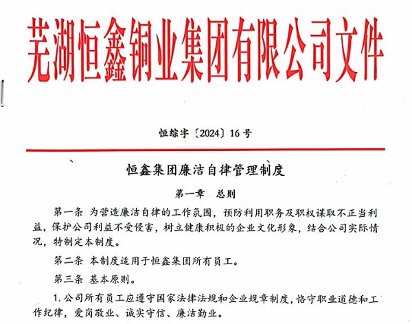 芜湖恒鑫铜业团体无限公司、飞尚贸易无限公司以“惩防并举、重视防备”为重点,连系“清廉自律标准”制定了响应的监视实行、违规处置、告发鼓励办法等。