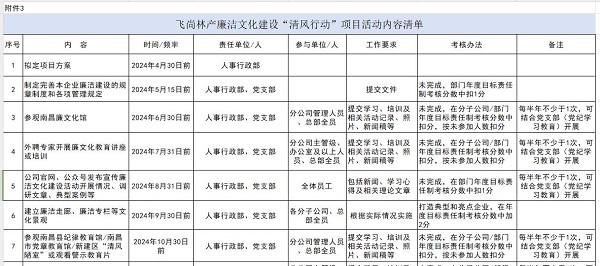 江西飞尚林产无限公司、盐城捷康三氯蔗糖制作无限公司在成立健全本企业《清廉自律办理轨制》的底子上,连系企业现实,制定了从勾当计划到勾当内容清单等的一系列轨制系统。贵州飞尚动力无限公司还订定了《员工清廉自律许诺书》,由许诺人具名并交地点部分和公司各执一份。